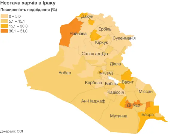 Але попри те, що процент невеликий, це становить 1,9 млн людей. Найбільше від недоїдання потерпають південні області Басра і Ті-Кар, а на півночі - Багдад і Найнава.