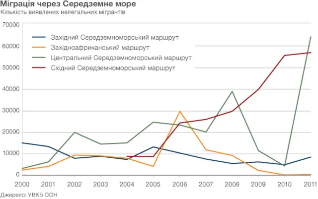 Число мігрантів, які використовують різні середземноморські маршрути, то зменшується, то знову зростає.