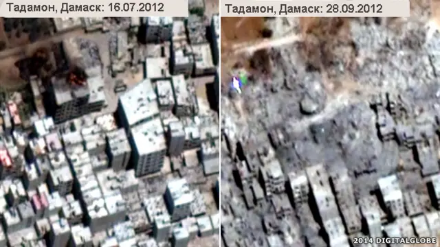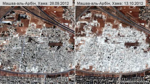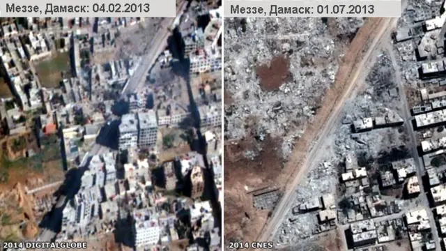 Фото із супутника показують масштабні руйнування будинків за допомогою вибухівки і бульдозерів, здійснені в опозиційних районах Дамаска і міста Хама у 2012 і 2013 роках.