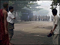 З Бірми повідомляють, що кілька сотень будистських ченців вирушили маршем у центрі бірманського найбільшого міста Ранґуна після того як поліція застосувала слізний газ та здійснила напад на групу людей включно з будистськими ченцями, що зібралися у центрі Ранґуна. Надходять повідомлення про попереджувальні постріли, що їх здійснила поліція. Свідки повідомили, що воєнізована поліція з водометами оточила головну пагоду у Ранґуні. Проте люди й надалі збираються на вулицях готуючись до нових виступів.