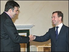 Російський президент Дмітрій Медведєв застеріг Грузію та Україну про серйозні наслідки, якщо ці дві країни втілюватимуть плани вступу до НАТО. Пан Медведєв і міністр закордонних справ Сергей Лавров сказали президентові Грузії Міхаїлу Саакашвілі, що приєднання до альянсу «посилить протистояння». Пан Лавров переповів, що президент Медведєв сказав президентові Ющенкові про можливе порушення Україною договору про дружбу, якщо Київ вступить до НАТО. На двосторонній зустрiчi в передмiстi Санкт-Петербурга Стрельнi президент Росiї Дмiтрiй Медведєв сказав президентові Ющенко досить неприємних речей. Зустріч відбувалася в межах неформального самiту країн СНД.