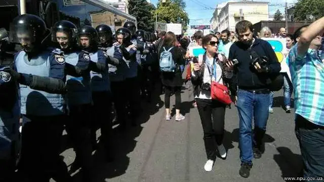 Перед початком руху колони правоохоронці відтіснили за периметр проведення акції кількох осіб, які з плакатами протестували проти проведення заходу.