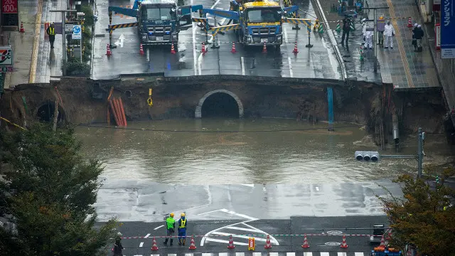 Гігантська воронка поглинула ділянку вулиці в центрі Фукуоки - одного з найбільших міст Японії.