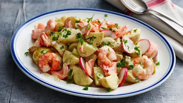 Картопляний салат з креветками - набагато елегантніша та корисніша альтернатива відомому з 1990-х салату з крабових паличок, без якого багато українців досі не уявляють святкового новорічного столу.