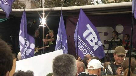 У натовпі виднілися транспаранти з лозунгами "ТВі - останній рубіж свободи", "Влада боїться правди", "Поверніть чесні новини" та інші.