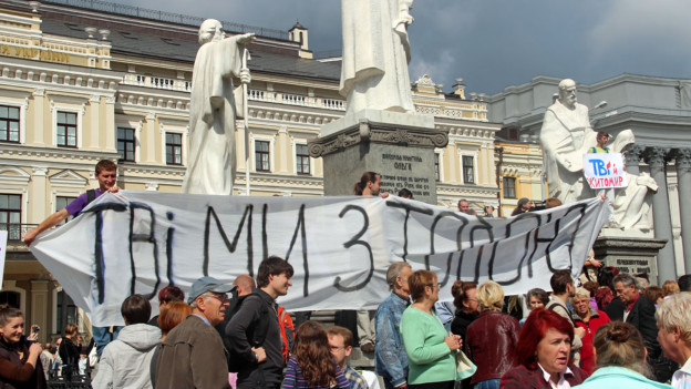 Декілька тисяч учасників акції протесту вимагали припинення відмикання телеканалу, де працюють українські опозиційні журналісти.