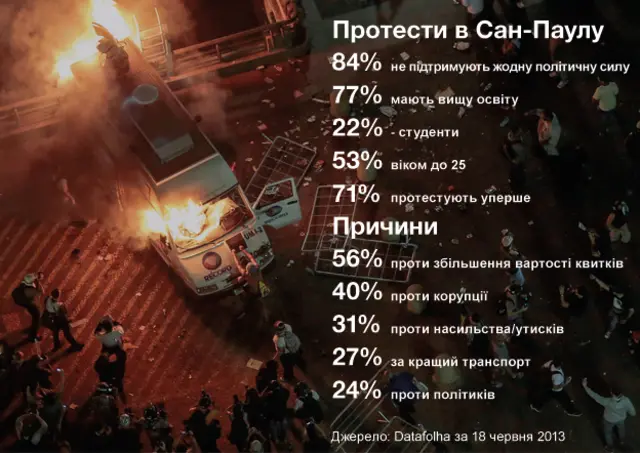 Протести почалися понад тиждень тому через підвищення вартості проїзду в транспорті, але переросли у вилив гніву через корупцію й високу вартість проведення футбольного чемпіонату світу 2014 року.