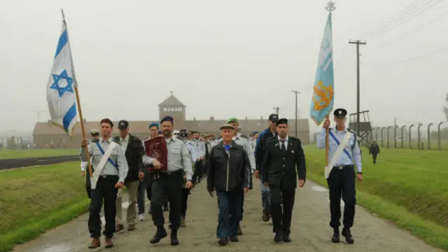Під кінець одноденного візиту до Аушвіцу ізраїльські солдати проводять церемонію, сповнену патріотичного символізму: піднімають "Зірку Давида" і співають державний гімн Ізраїлю.