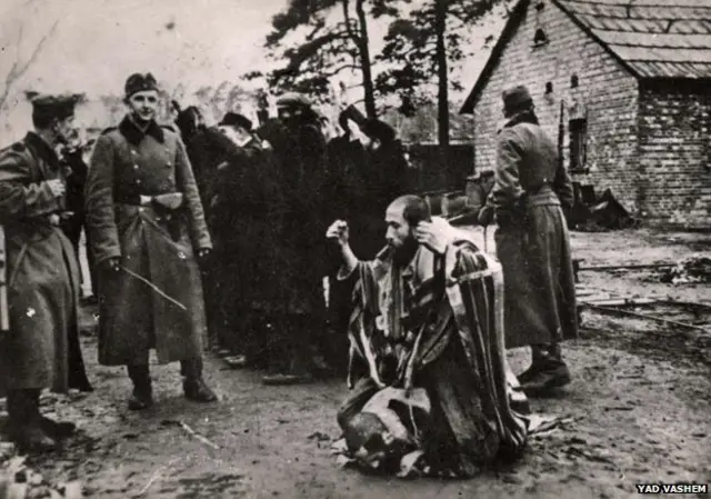 Ця злегка пошарпана чорно-біла фотографія, на якій літній єврей стоїть на колінах, в оточенні німецьких солдатів. Це було в 1942 році в польському селі Луків.