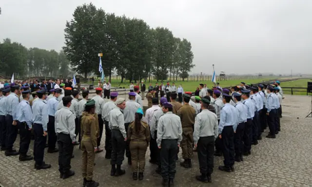 Але делегація привертає увагу туристів. Німці, поляки і японці знімають на свої мобільні телефони, як ізраїльтяни проходять строєм поруч із залізничними коліями, якими нацисти відправили на смерть більше мільйона євреїв.