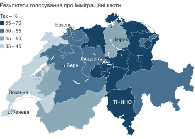 Як розповідає кореспондент ВВС, результати референдуму засвідчили традиційні розбіжності між франкомовними кантонами на заході країни (проти квот), німецькомовними кантонами (думки розійшлися) і італійськомовним кантоном Тічино (за квоти).