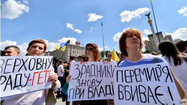 У заяві, озвученій на мітингу, вони вимагали від президента припинити перемир'я і запровадити на сході країни військовий стан, а також забезпечити добровольців батальйонів зброєю.
