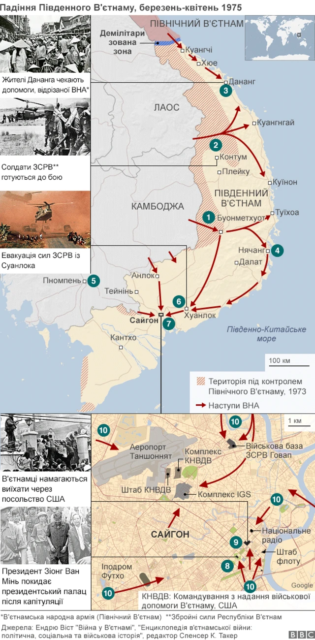 На 40-ву річницю падіння Сайгона ми пропонуємо вашій увазі перебіг подій, що передували поразці Півдня. Швидка перемога північнов'єтнамських військ у центральних горах завдала нищівного удару по моралі армії Південного В'єтнаму. В умовах небажання Америки брати подальшу участь у війні найбільші міста узбережжя склали зброю протягом трьох тижнів. Після того, як на початку квітня здався останній стратегічний опорний пункт, єдине, що залишалося американським військовим планувальникам, - евакуювати якомога більше людей. 30 квітня група танків прорвалася крізь ворота президентського палацу в Сайгоні. Війна закінчилася, хоча дискусії про неї тривають донині.