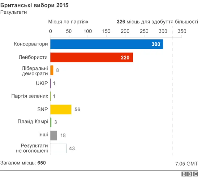За даними опитування, консерватори отримають 316 місць у парламенті, тоді як лейбористи можуть мати 239 своїх представників. Згідно із прогнозом ВВС, консерватори взагалі отримують 325 місць, а лейбористи 232.