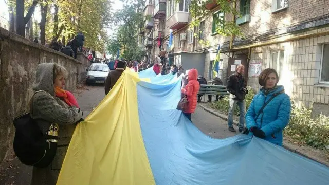 У дворі перед Лук'янівським СІЗО розгорнули національні прапори України.