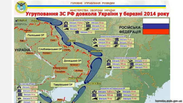 "Агресор розраховував на застосування Україною військової сили для відновлення влади в Криму, що давало Росії фактично легітимні підстави для військового вторгнення в Україну. План російської Федерації передбачав окупацію Східної і Південної України, і створення коридору через Одеську область до Придністров'я", - заявив Вадим Скібіцький, надавши дані про чисельність російського війська на східному кордоні України на березень 2014 року.