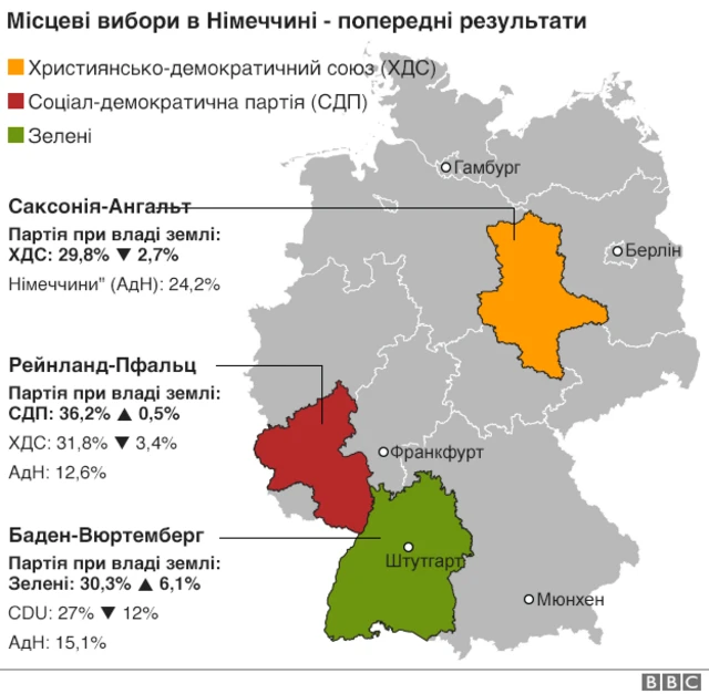 Християнські демократи втратили третину голосів в Баден-Вюртемберзі, досягнувши там історичного мінімуму в 27%. Партія зелених прийшла в цій землі першою, а АдН набрала 15% голосів.