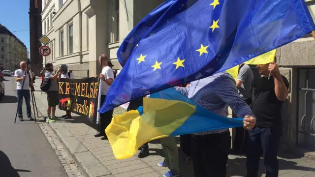 Проти відкриття "представництва ДНР" - близько десятка активістів. Вони зібралися біля готелю, де відбувався захід, зі стягами Євросоюзу й України. І з плакатами: "Кремлівський театр", "Не хочемо терористичної організації ДНР у Чехії" та "Чеська маріонетка на службі у тоталітарного Мордора".