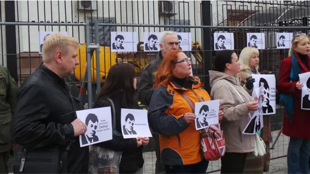 Під посольством Росії в Україні протестують кілька десятків журналістів, блогерів та колег затриманого у Москві кореспондента агенції "Укрінформ" Романа Сущенка і вимагають звільнити журналіста.