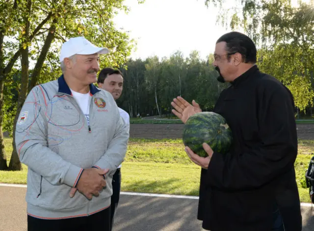 Олександр Лукашенко вирішив вразити заокеанського гостя досягненнями місцевого сільського господарства. Актору показали білоруські буряки, капусту і моркву, а також продемонстрували збір картоплі і кавунів. "Ще п'ять років тому було важко уявити, що на нашій землі вирощуватимуть отакі кавуни. А сьогодні вони особливо зацікавили гостя", - тішилася пані Ейсмонт.