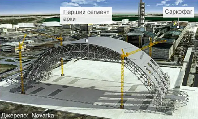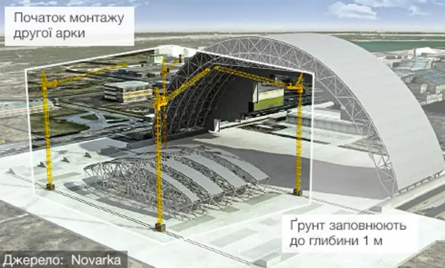 Арку збирають двома половинами на відстані 300 метрів від четвертого реактора, щоб захистити робітників від радіації. Об'єкт має бути завершено у 2015 році.