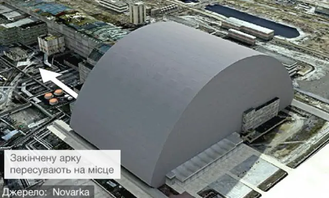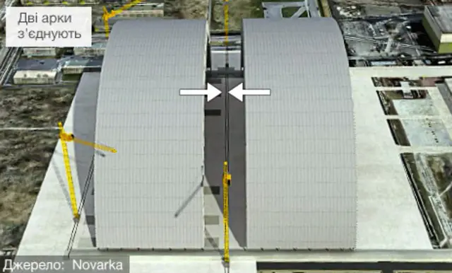 Тому арку доводиться збирати за кількасот метрів, на безпечнішій відстані від інтенсивної радіації реактора. Половина акри вже готова, а коли буде зібрано другу половину, обидві частини з'єднають. Після чого під пильною увагою інженерів 29 тисяч тонн металу просунуть спеціально для цього прокладеною колією, а коли вони стане над реактором, то обидві половини герметично закриють.