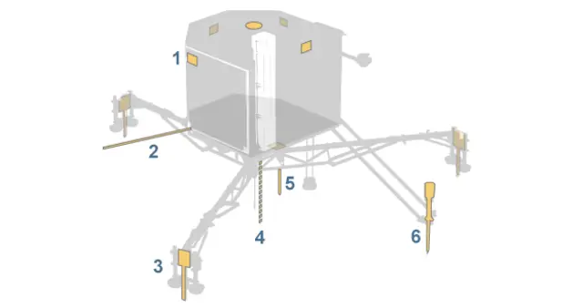 4: Бур для збору зразків - SD2 - може вести буріння на глибину більш ніж 20 см, збирати зразки і відправляти їх для дослідження із застосуванням (тут же, на борту) лабораторного обладнання COSAC і PTOLEMY