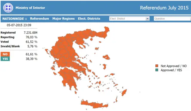 За даними грецького МВС, явка на референдум в Греції склала більше 50%. Це означає, що його мають визнати дійсним (для цього треба, щоб явка склала не менше 40% зареєстрованих виборців).
