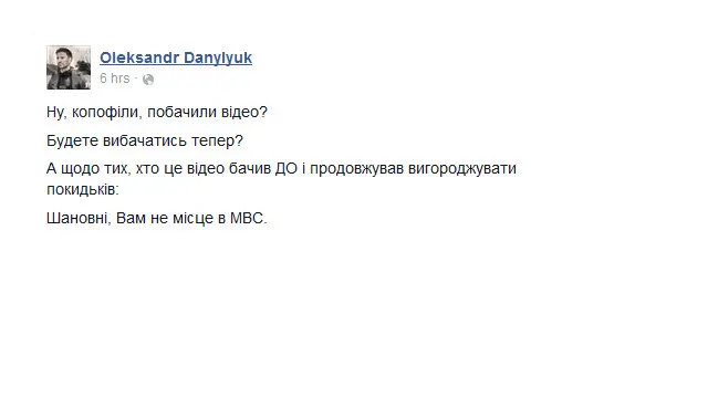 Різко засудив дії поліції координатор громадського руху "Спільна справа"<link type="page"><caption> Олександр Данилюк</caption><url href="https://www.facebook.com/danylyuk?fref=ts" platform="highweb"/></link>.