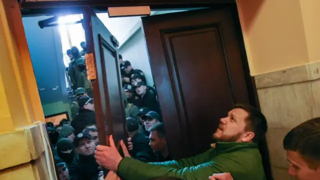 Активісти хотіли зайти у приміщення. У результаті між ними та охоронцями виник конфлікт через те, що їх не пропустили в будівлю, описує те, що сталося, поліція. Мітингувальники перекрили вулицю Хрещатик.