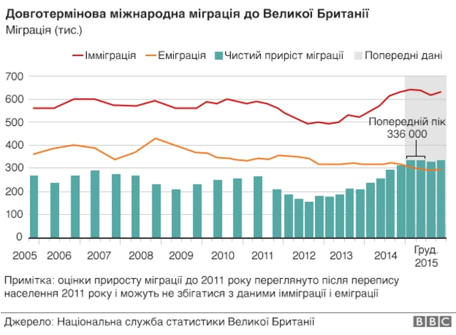 Приріст міграції - різниця між числом людей, які приїхали на постійне проживання у Великій Британії, і тих, які виїхали з країни.
