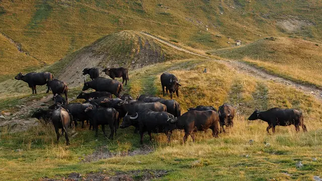 Із тридцятьма буйволами йдуть два коні, які везуть речі, та корова, яка теж провела літо на полонині. Її ведуть за собою двоє журналістів зі Швейцарії, які приєдналися до подорожі.