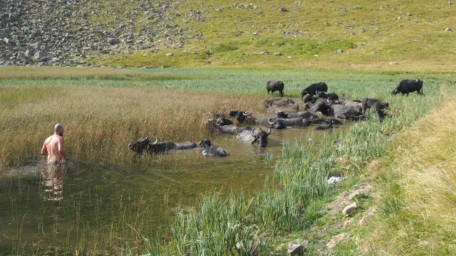 У спекотний день озеро Догяска здається міражем серед високогір’я. Тварини відчувають, що вода близько, прискорюються. Біля озера багато туристів, граються діти. Стадо буйволів задоволено занурюється. Старший Микола купається разом із ними, тре буйволам спини, чухає.