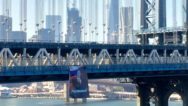 Невідомі у Нью-Йорку вивішували банер з Володимиром Путіним площею шість на десять метрів на Мангеттенському мосту.