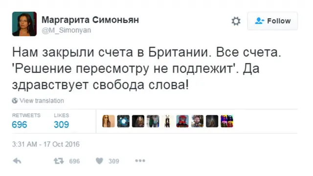"Нам закрили рахунки в Британії. Всі рахунки. "Рішення перегляду не підлягає". Хай живе свобода слова!" - написала пані Симоньян у Twitter.