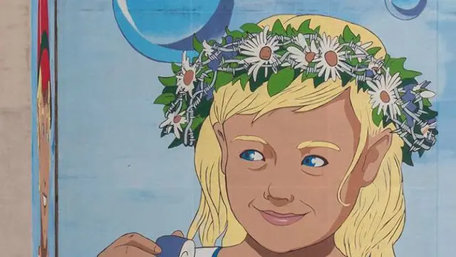 На малюнку - хлопчик і дівчинка в одязі, прикрашеному гербами Москви і Мінська. Після переробки у вінку, в якому стоїть дівчинка, і в букеті, який тримає хлопчик, з'явилися фрагменти колючого дроту.