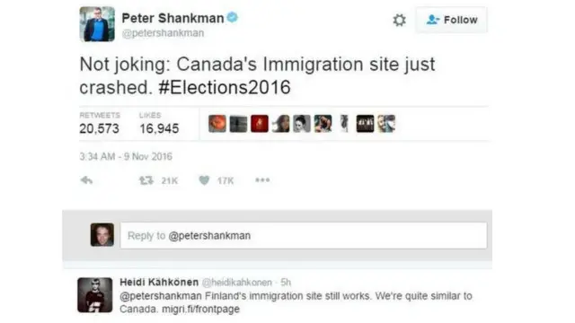 Тим часом представники імміграційної влади Нової Зеландії повідомили Reuters, що від 1 листопада до ночі виборів у США офіційний сайт із інформацією про візи для проживання та навчання у країні отримав понад половину від тієї кількості заявок, яку зазвичай отримує від громадян США за цілий місяць.