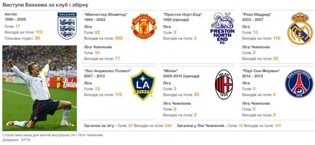 У тиждень, коли Девід Бекхем оголосив про завершення кар'єри професійного футболіста, ми пропонуємо статистику його футбольного життя.
