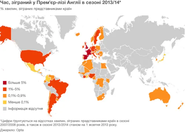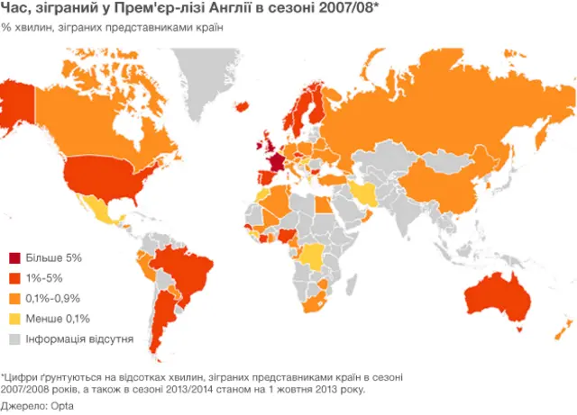 В дослідженні BBC аналізували кількість хвилин, зіграних представниками країн в Прем’єр-лізі, чемпіонаті та Шотландській лізі в цьому сезоні у порівнянні з сезоном 2007-2008 років.