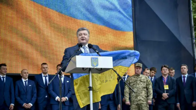 Також пан Порошенко назвав футбол частиною націєтворчого процесу і згадав Євро-2012, коли чемпіонат приймала Україна, і в Донецьку "майоріли українські прапори та звучав українській гімн".
