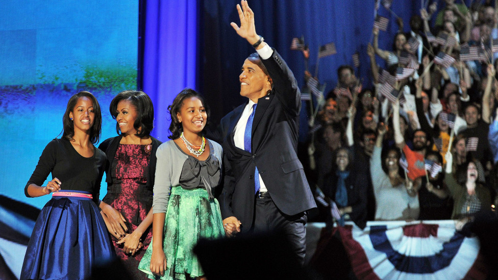 Барак Обама произнес речь, в которой призвал американцев к единению для решения общих проблем. Выражая избирателям и своей семье благодарность за поддержку, Обама поблагодарил и своих дочерей. При этом отец пошутил, что, несмотря на победу, дома они могут держать только одну собаку