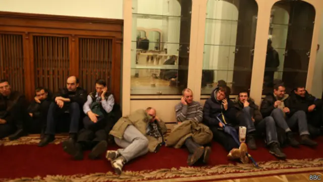 В здании много разбитых окон, но мусор убирают, и митингующие, по словам нашего корреспондента, ведут себя сдержанно.
