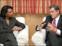 Американський державний секретар Кондоліза Райс заявила в комітеті Сенату із закордонної політики, що завуальовані погрози Росії стосовно України є, як вона висловилася, "неприйнятними та гідними осуду". Пані Райс пояснила, що Росія іде на міжнародну співпрацю у відвернені ядерної загрози з боку Північної Кореї, але коли мова йде про структури безпеки у Європі, які утворилися після Холодної війни, то з Москви лунає такого типу риторика: "Це недружня і можна сказати гідна осуду риторика, що лунає з Москви є неприйнятною. Вона не допомагає відносинам, які у певних аспектах є позитивними». За словами Держсекретаря США: «НАТО робитиме усе, що вважає необхідним як альянс і Росія не матиме права вето. «Ми абсолютно віддано підтримуємо незалежність та суверенітет України та інших країн, які колись були частиною СРСР» Щодо можливості приєднання України та Грузії до Плану дій з набуття членства у НАТО, пані Райс заявила, що ті країни повинні отримати такий статус «коли вони будуть готові і спроможні виконувати зобов’язання, які такий статус передбачає».