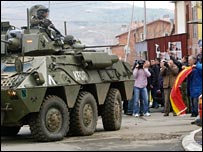 За словами оонівця протести були організовані і забезпечені вантажівками з камінням та автобусами для переміщення людей. Пан Росін також закликав Бєлград до усвідомлення, що миротворці ООН у Косові діють згідно резолюції Ради Безпеки, яка визнає за Сербією юрисдикції над провінцією. Ця резолюція буде діяти, доки ООН не ухвалить змін до статусу своєї присутності у Косові. Наразі, поліцейські сили ООН виведені з півночі провінції, де контроль на себе перебрали військові миротворці країн НАТО. | Також на цю тему Помер українець, поранений у Мітровіці18 березня, 2008 | СВІТ 15 українців поранено під час штурму суду в Косово17 березня 2008 | Головна сторінка Світ засуджує напади на посольства у Белграді22 лютого, 2008 | СВІТ Незалежність Косова викликає розбіжності18 лютого, 2008 | СВІТ Інші сайти Бі-Бі-Сі не несе відповідальності за зміст інших сторінок на інтернеті | |||||||||||||||||||||||||||||||||||||||||||||||||||||||||||||||||||||||||||||||