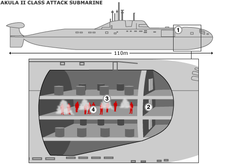 Російські представники надали нові подробиці інциденту, який стався в суботу на борту атомного підводного човна, коли загинула 20 людей і 21 людина була поранена під час навчань у Японському морі. Речники флоту кажуть, що моряки і цивільні працівники загинули від удушення, коли вогнегасна система випадково спрацювала у носовій частині судна. Речник комісії, яка провадить розслідування, Владімір Маркін, сказав, що смерть людей на неназваному підводному човні була спричинена вдихання газу: "Перші результати судмедекспертизи показали, що смерть сталася в результаті потрапляння газу фреон у легені жертв".