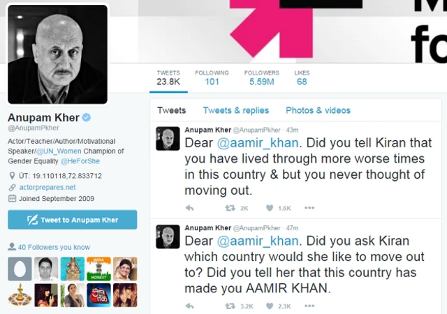 انوپم کھیر نے عامر کو مخاطب کرتے ہوئے ایک اور ٹویٹ میں کہا ’کیا آپ نے کرن کو بتایا ہے کہ آپ اس ملک میں اس سے بھی زیادہ برے دور میں رہے ہیں لیکن آپ نے کبھی ملک چھوڑنے کا نہیں سوچا۔‘