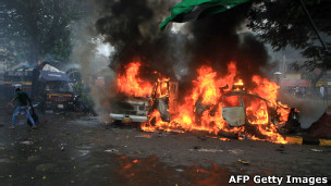 دیکھتے ہی دیکھتے اس ہجوم نے تشدد کی راہ اپنا لی اور متعدد گاڑیوں میں آگ لگانے کے علاوہ کئی بسوں کو بھی نقصان پہنچایا۔