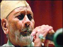 | | | شہنائی نواز استاد بسم اللہ خان | شہنائی کے شائقین میں سے کس نے بسم اللہ خان کا نام نہیں سنا ہوگا۔ شہنائی نواز استاد بسم اللہ خان اب نوے برس کے ہو چکے ہیں۔ ان کی یہ تمنا تھی کہ وہ دلی کے انڈیا گیٹ پر شہنائی کا جادو جگا سکیں۔ حکومت نے ان کی اس تمنا کی تکمیل کے لیئے انڈیا گیٹ پر تقریبات سے ایک دن کے لیئے پابندی ہٹائی ہے اور استاد بسم اللہ خان اب ستائیس جولائی کو اپنے فن کا مظاہرہ کریں گے۔ اس سے قبل وہ اگست دو ہزار تین میں پارلیمنٹ ہاؤس کے احاطے میں بھی اپنی شہنائی کا جادو جگا چکے ہیں۔بیوی کا تنازعہ