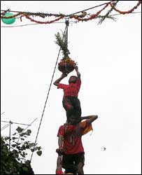 آج ہندؤں کا مذہبی تہوار جنماشٹمی (گووندہ ) ہے۔ ہندو عقیدت مند یہ تہوار اپنے بھگوان کرشن کی پیدائش پر مناتے ہیں لیکن اس مرتبہ اس پرگہرا سیاسی رنگ چھایا ہوا ہے اور ہر سیاسی پارٹی نے دہی ہانڈی پھوڑنے والوں کو لاکھوں روپے بطور انعام دینے کا اعلان کیا ہے۔ دہی ہانڈی پھوڑنے کے لیئے تربیت یافتہ لڑکوں کے’منڈل‘ہوتے ہیں اور انہیں اپنی جانب راغب کرنے کے لیئے سیاسی پارٹیاں لاکھوں روپے انعام کا اعلان کرتی ہیں اور اسی کے ساتھ اپنی تشہیر کے لیئے پارٹی کے نشان اور نام کے ساتھ ٹی شرٹس تقسیم کرتی ہیں۔ شیو سینا سے علیحدہ ہونے والی مہاراشٹر کی علاقائی پارٹی نو نرمان سینا کے سربراہ راج ٹھاکرے نے دہی ہانڈی پھوڑنے والوں کے لیئے بائیس لاکھ روپے انعام کا اعلان کیا ہے۔ ممبئی اور اس کے مضافات میں 173 ہانڈیاں نو نرمان سینا کے منڈل توڑیں گے۔ سب سے اونچی ہانڈی پھوڑنے والے منڈل کوگیارہ لاکھ روپے دیئے جائیں گے اور بقیہ ہر دہی ہانڈی کے لیئے اکیاون ہزار روپے کا انعام دیا جائےگا۔ سیاسی پارٹیوں میں دہی ہانڈی پھوڑنے کی دوڑ لگی ہے ۔ شیوسینا پارٹی نے شہر میں پانچ سو ہانڈیاں پھوڑنے کا اعلان کیا ہے تو وہیں نیشنلسٹ کانگریس پارٹی اور کانگریس پارٹی کی ایک سو پچیس ہانڈیاں ہوں گی جسے مختلف منڈل توڑیں گے۔ این سی پی لیڈر سچن اہیر نے کہا ہے کہ ان کی پارٹی شہر میں ایک سو پچیس ہانڈیاں پھوڑنے والوں کو انعام سے نوازيں گی لیکن انہوں نے رقم بتانے سے انکار کرتے ہوئے دعوی کیا کہ اس میں کسی طرح کی سیاست ملوث نہیں ہے۔ اس’گوکل اشٹمی‘ کے موقع پر پہلی مرتبہ غیر ملکی فلمساز بھی اس میں حصہ لے رہے ہیں اور سپین میں سب سے اونچا انسانی اہرام بنانے والی ٹیم ممبئی میں دہی ہانڈی کے دوران بننے والی زنجیر کو فلمانے کا ارادہ رکھتی ہے۔ | اسی بارے میں حسین ساگر: مورتیوں کی غرقابی سے آلودگی21 July, 2006 | انڈیا | ||||||||||||||||||||||||||||||||||||||||