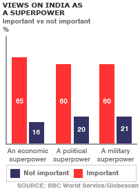 بی بی سی کے پول کے مطابق بھارتی عوام اپنے ملک کو ایک عالمی طاقت دیکھنا چاہتے ہیں اور ان کے خیال میں ذات پات کا نظام اس حوالے سے ایک بڑی رکاوٹ ہے۔ بی بی سی ورلڈ سروس کے اس پول میں حصہ لینے والے پچپن فیصد افراد کے خیال میں بھارت میں ذات کا نظام’معاشرتی ہم آہنگی‘ میں ایک بڑی رکاوٹ ہے۔ دو تہائی بھارتیوں کا ماننا ہے ملک کو ایک اقتصادی سپر پاور ہونا چاہیے جبکہ ساٹھ فیصد کے نزدیک اقتصادی قوت کے ہمراہ سیاسی اور ساٹھ فیصد کے ہی خیال میں عسکری طاقت بننا بھی ضروری ہے۔ اس پول سے یہ بھی پتہ چلا ہے کہ اکہتر فیصد افراد بھارتی ہونے پر فخر محسوس کرتے ہیں اور اکثریت جدید بھارتی ریاست کے بیشتر پہلوؤں کے حوالے سے پرامید ہے۔ نصف سے زائد کے خیال میں بھارت کا عدالتی نظام غریب اور امیر دونوں سے یکساں سلوک کرتا ہے اور باون فیصد کا ماننا ہے کہ اب بھارت میں عورت ہونا ترقی کی راہ میں رکاوٹ نہیں۔ سروے میں شامل اڑتالیس فیصد افراد نجی اداروں کے لیے کام کرنے کے متمنی ہیں جبکہ حکومتی اداروں کے لیے کام کرنے کی خواہش رکھنے والوں کی تعداد صرف بائیس فیصد ہے۔